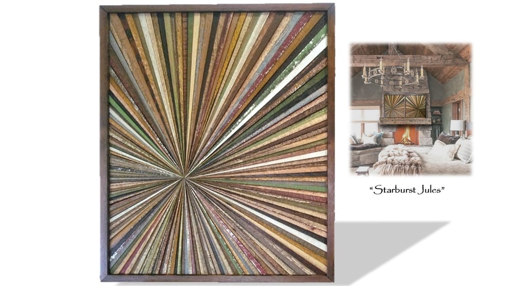 Handcrafted artwork made from individual strips of beautifully textured reclaimed rough sawn cedar fencing. Meticulously tapered, cut to a razor thin point, each strip is hand finished in a wide array of custom colors, sanded and installed one by one.